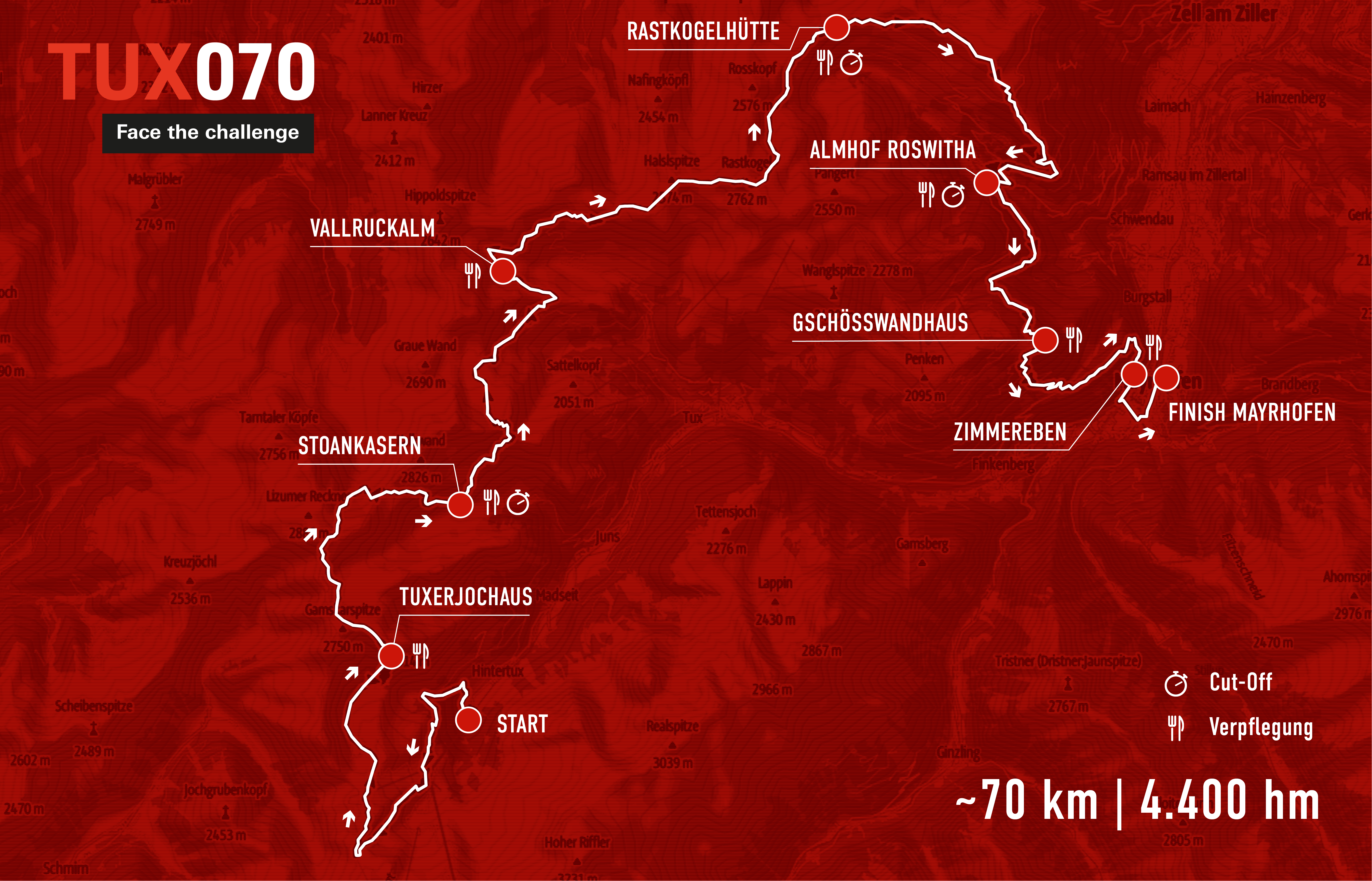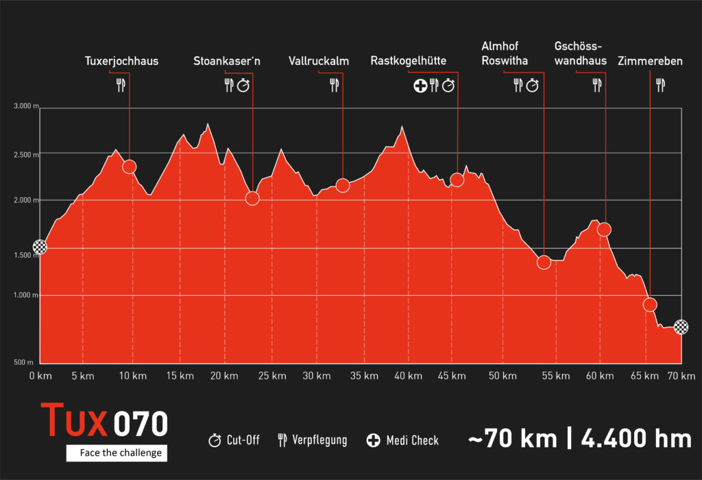 Unlike the other routes of the Mayrhofen Ultraks, the TUX070 does not start directly in Mayrhofen but at the parking lot of the Gletscherbahnen Hintertux. The first kilometers you still need your headlamp to master the uphill to the Frauenwand. There, great views and a unique sunrise await you. Over the Tuxerjoch and the main ridge of the Zillertal Alps, the route leads you in the direction of Stoankasern to the Rastkogel. Here you will meet the part of the RK50 route and take the last kilometers of a technical downhill into the town center of Mayrhofen, where the spectators are already waiting for you.